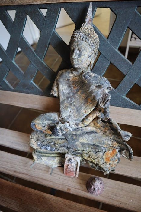 Die Buddhafigur, die oben abgebildet ist, stammt aus einem verbrannten Gebäude im Waldkloster Aloka Vihara in Kalifornien, das im August 2021 von einem Waldbrand betroffen wurde. Die wichtigsten Gebäude blieben zum Glück unversehrt, doch einige kleinere Gebäude verbrannten, und in einem davon befand sich diese Figur. Sie kann symbolisch dafür stehen, dass unser aller Leben, ebenso wie das des Buddha, ein Ende hat.